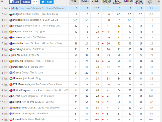 На даний момент перемогу пророчать Італії, яку представляє Франческо Габбані з піснею Occidentali's Karmа, повідомляють Патріоти України з посиланням на Нескучные новости.