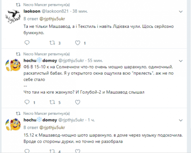 «15.12. Донецк. Машзавод. Мощно шото шарахнуло, в доме через музыку подскочила. Вроде со стороны дурки, но точно не разобрала».
