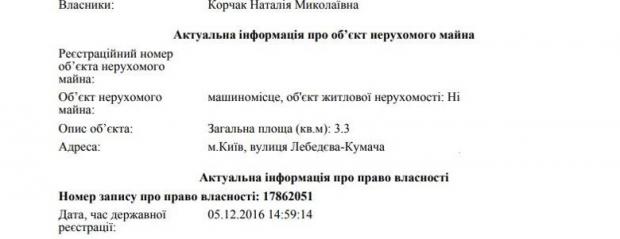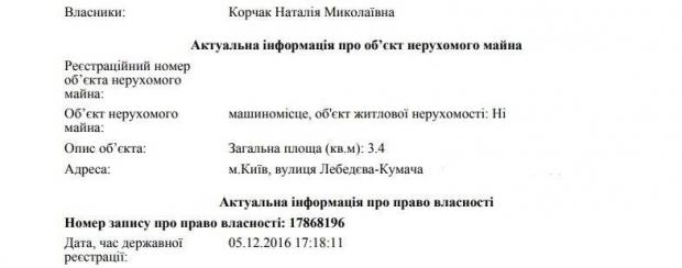 За даними Єдиного реєстру нерухомого майна, у Наталії Корчак є три місця на парковці – два площею 3,4 кв. м і одне на 3,3 квадрата. Всі три гаражі знаходяться на території підземного паркінгу нового ЖК в Солом’янському районі Києва.