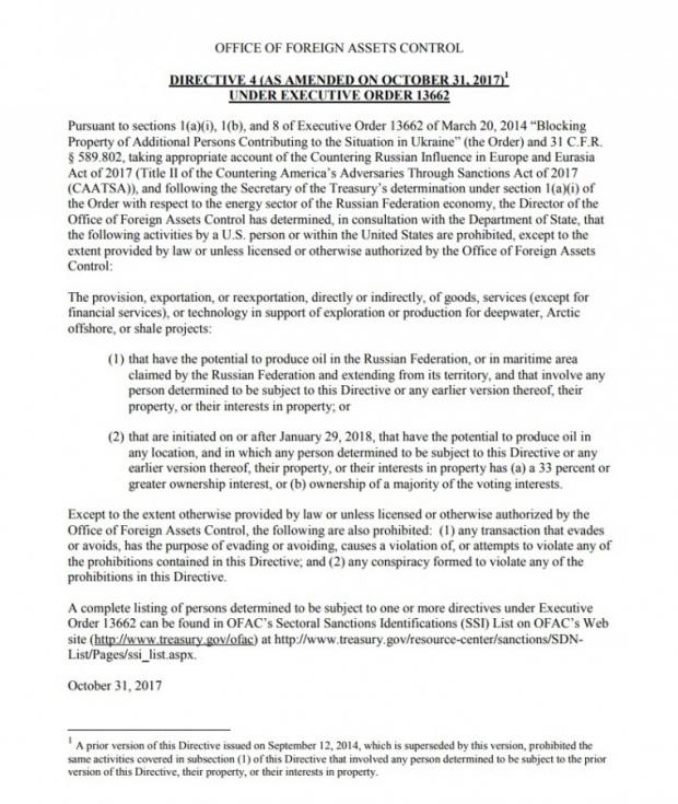 З 2018 року дана директива буде стосуватися не тільки нафтовидобувних проектів на території РФ, а й за її межами. Тобто, участь Росії в міжнародній нафтовидобутку так само виявиться під великим питанням.
