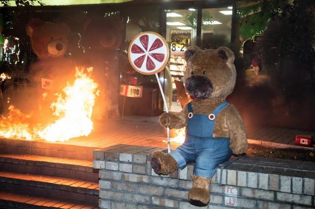"В Хеллоуиновскую ночь напротив одного из магазинов торгующих конфетами произвольно самовозгорелись плюшевые монстры. Совершенно случайно на месте происшествия оказалась секстремистка FEMEN с традиционным для этого дня призывом: конфеты или импичмент.