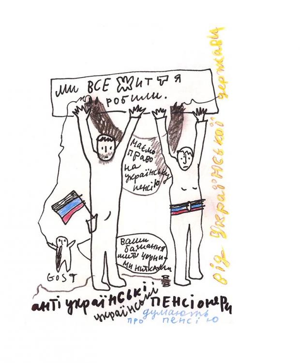 - Ваша мама розповідає вам про це?- Вона мені просто переказує, що там говорять. Наприклад, антиукраїнські літні люди (на мій погляд, є проросійські, а є антиукраїнські), які є досі громадянами України і мають право на цю пенсію, кажуть, мовляв, "от ми все життя робили, ми заробили цю українську пенсію". Але ти розумієш, що у цих людей відсутнє розуміння причинно-наслідкових зв'язків. Чому? Якщо вони антиукраїнські налаштовані, значить, вони бажають Україні не добробуту і розвитку, а, навпаки, смерті. Вірно? Але в такому разі вони взагалі не зможуть цю пенсію отримати, її ж їм платять працездатні молоді люди, такі, як ми з вами. А оскільки вони бажають Україні не благополуччя, а смерті, то виходить, що якщо вона дійсно зникне як держава, то їм ніхто ніколи її не нарахує. І це ознака того, що вони не розуміють ситуацію.