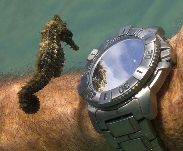 Морський коник вдивляється у власне відображення на годиннику дайвера