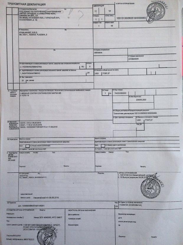 Это - транзитная транспортная декларация, она датирована маем 2016 года. По поручению Chapterseven limited тот же ООО «ЮНИС» отгружает на тот же SteelInvest в Словакию 20 тонн латунных слитков. Страна отправления – Украина, груз прибывает на таможню на автомобилях с номерами ВВ (Луганская область). В другой аналогичной декларации фигурирует 20 тонн медных слитков.