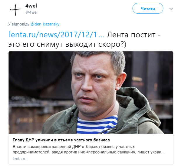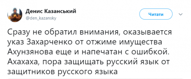 "Відразу не звернув уваги, виявляється указ Захарченко про віджимання майна Ахунзянова ще й надрукований з помилкою. Ахахаха, пора захищати російську мову від захисників російської мови", - написав він.