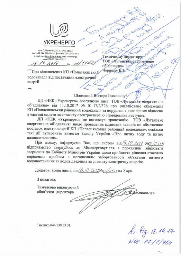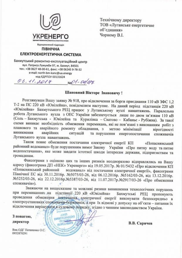 Луганське енергетичне об'єднання вже неодноразово відключало електропостачання об'єктам Попасняського водоканалу, до яких має доступ, але нажаль, ДП «НЕК «Укренерго» не дає нам знеструмити насоси ЗФС, що є головною потужністю, що забезпечує «ЛНР» водою.