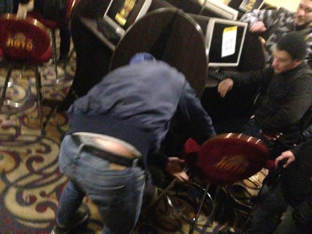 Як повідомляє наш кореспондент, активісти заклеїли двері приміщення стікерами з написами «Цей гральний заклад належить країні-агресору», а також залишили написи на стінах: «Шахраї геть» і «Криваві гроші».