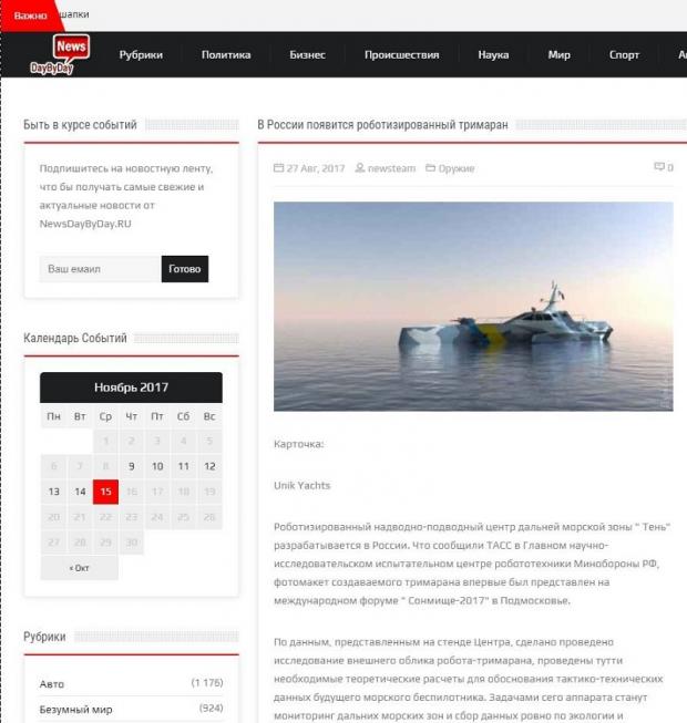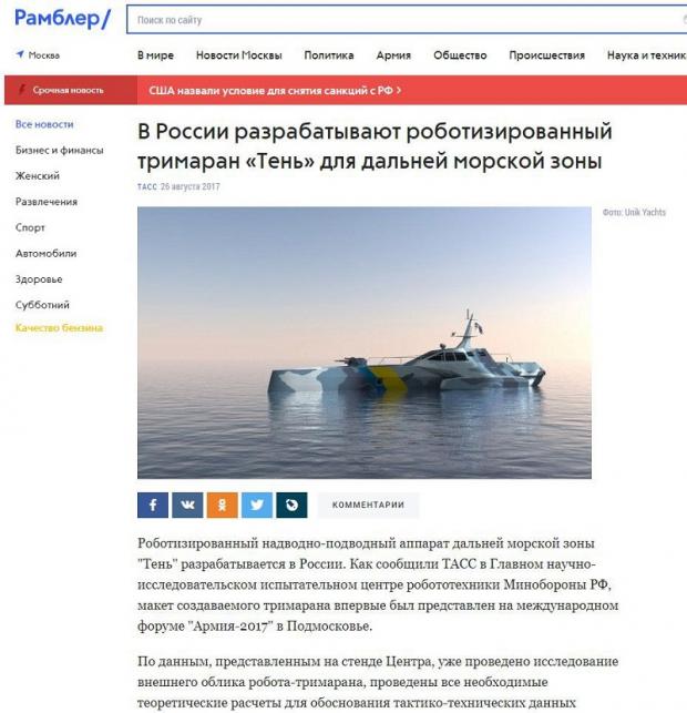 У ЗМІ була опублікована інформація про розробку російськими конструкторами Головного науково-дослідного випробувального центру робототехніки Міноборони РФ безпілотного тримарана "Тінь". На підтвердження було викладено фото однієї з перших версій патрульного тримарана UNIK PB325 роботи над яким веде компанія Unik Yachts.