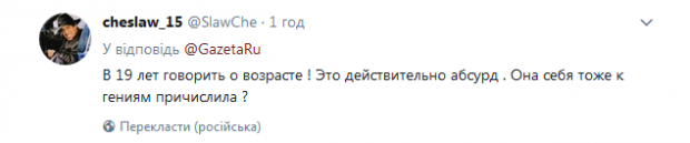 «В 19 лет говорить о возрасте! Это действительно абсурд. Она себя тоже к гениям причислила?» - написал пользователь Twiiter cheslaw_15.