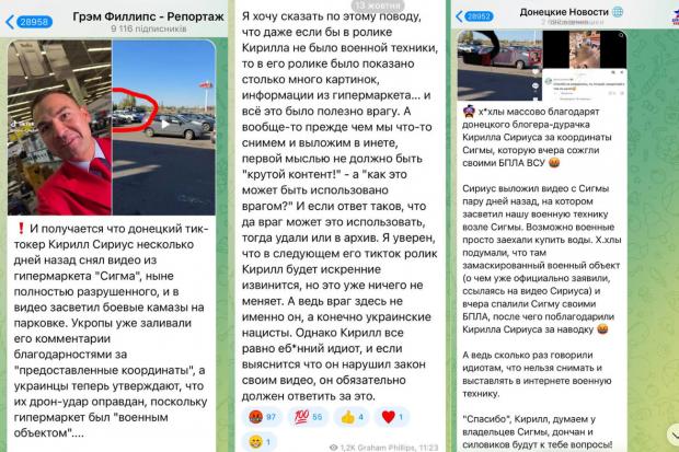 "Місцевого дурника-тіктокера Кирила Сіріуса звинувачують у тому, що він видав розташування російських військ біля супермаркету «Ашан» (після віджиму перейменований на «Сігму»), внаслідок чого туди прилетіло і супермаркет згорів", - пише журналіст Денис Казанський у соцмережі "Фейсбук", передають Патріоти України, та продовжує: