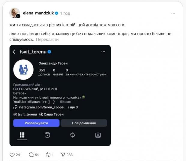 Українська блогерка Олена Мандзюк оголосила, що більше не спілкується з ветераном російсько-української війни, героєм реаліті "Холостяк-13" Олександром Тереном. Вранці у понеділок, 27 жовтня, блогерка опублікувала в Threads скриншот, на якому можна побачити, що вона заблокувала Терена в Instagram, передають Патріоти України.