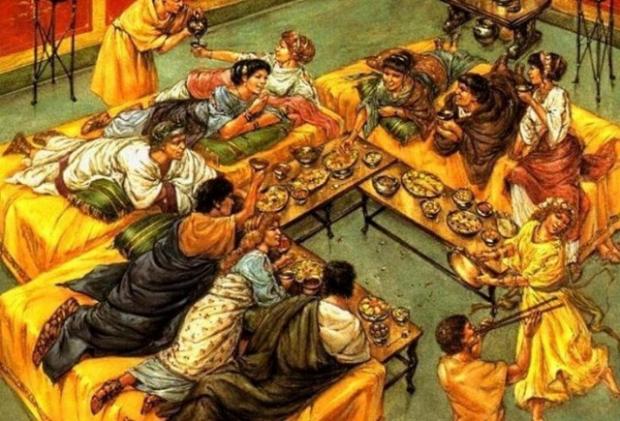 Уявіть собі, в стародавньому Римі сидіти за званим частуванням — це доля жінки, або убогого клієнта та артиста, якого щедрий господар за вдалий виступ покликав приєднатись до столу. А справжній патрицій їсть лежачи, розслаблено, ніде не поспішаючи, нагадують Патріоти України.