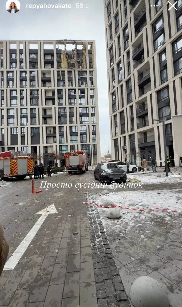 Постраждав сусідній від Реп'яхової та Павліка будинок. Деякі квартири повністю зруйновані. «Я була впевнена, що приліт у наш будинок, бо неможливо було відчинити двері, якесь сильне повітря дуло у під'їзді і спрацювала сигналізація», — зазначила Реп'яхова. Павлік і Реп'яхова винаймають квартиру на Лівому березі Києва.