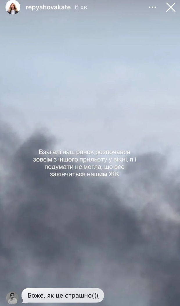 «Взагалі наш ранок почався зовсім з іншого прильоту у вікні, я й подумати не могла, що все закінчиться нашим ЖК», — додала блогерка.