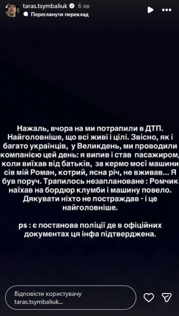 «На жаль, вчора ми потрапили в ДТП. Найголовніше, що всі живі й цілі. Звісно, як і багато українців, у Великдень, ми проводили компанією цей день. Я випив і став пасажиром, коли виїхав від батьків, за кермо моєї машини сів мій Роман, котрий, ясна річ, не вживав. Я був поруч. Трапилось не заплановане, Ромчик наїхав на бордюр клумби й машину повело. Дякувати, ніхто не постраждав, і це найголовніше. Є постанова поліції, де в офіційних документах ця інформація підтверджена», — прокоментував актор.