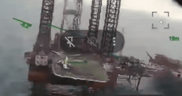 На опублікованих кадрах видно, як морські безекіпажні дрони та авіаційні безпілотні апарати завдають ударів по об’єктах ворога. Один з українських БпЛА влучив у російських вертоліт у той час, коли він саме здійснював приземлення на платформу бурової установки.