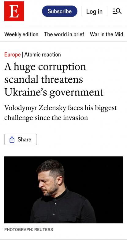 Стаття The Economist називає викриту в енергетиці України корупційну схему «найбільшою кризою від часу вторгнення 2022 р.». Західні партнери вже заявляють: допомога від них не безумовна — вона залежить від довіри, яку київська влада має відновити. . ...