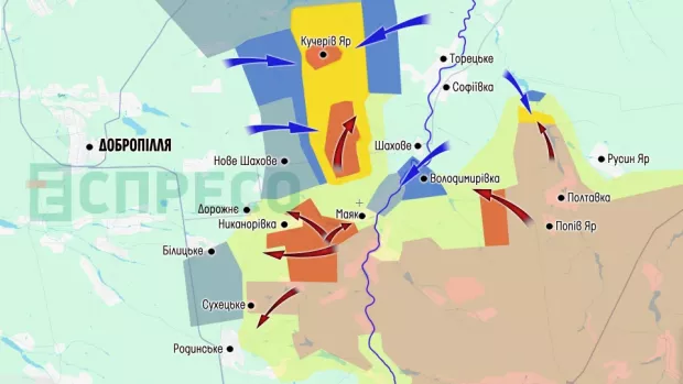 Зокрема, ворог продавлює нашу оборону на двох дирекціях: через Вербове та Олексіївку. Ці два села розташовані у межиріччі Вовчої та Янчура, а позаду них надважлива дорога Покровське – Гуляйполе. Тож не маючи природних перешкод, росіяни штурмують нашу оборону в цих селах. Наразі тут йдуть бої. А тим часом ворог обійшов Вербове із півдня та намагається пробитися до Вишневого, де є міст через Янчур. Тут він також спробує форсувати річку.
