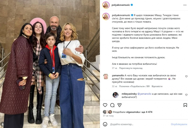 Оля Полякова в Instagram зазначила, що заяви Буряковського її «шокували». Співачка перепросила у своєї зіркової подруги. «Я щиро поважаю Машу, Тимура і їхню сім'ю. Для мене це приклад гідних, міцних і довготривалих стосунків, до яких є тільки повага. Саме тому мені було вкрай неприємно почути слова мого чоловіка в його інтерв'ю на адресу Маші і її родини — я їх не поділяю і відверто кажучи була шокована його заявами, які могли зробити боляче важливим для мене людям. Мені шкода. Я хочу це чітко зафіксувати: це його особиста позиція. Не моя. Іноді близькість не означає тотожність думок. Але я вважаю за потрібне попросити вибачення», — написала артистка.