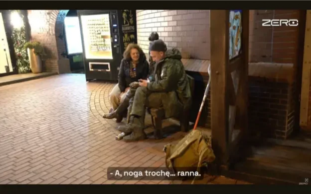 До всіх своїх співрозмовників журналістка посміхається, іноді ввічливо їм підтакує. Так само м’яко вона звертається до чоловіка у військовій формі. Побачивши на лавці солдата армії РФ, Вєрніковська питає дозволу сісти поруч.