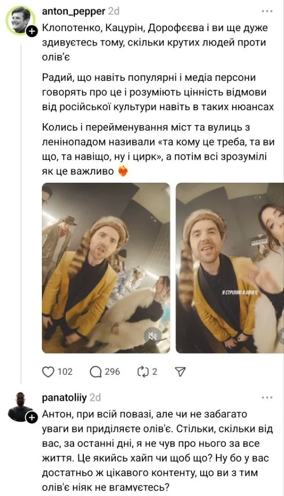 Він зазначає, що відмова від олів'є є символом постколоніальної боротьби проти імперії, яка витіснила традиційні українські страви зі столів, замінивши їх радянськими. Ресторатор Міша Кацурін і співачка Надя Дорофєєва також публічно висловилися проти олів'є, підтримавши цю позицію.