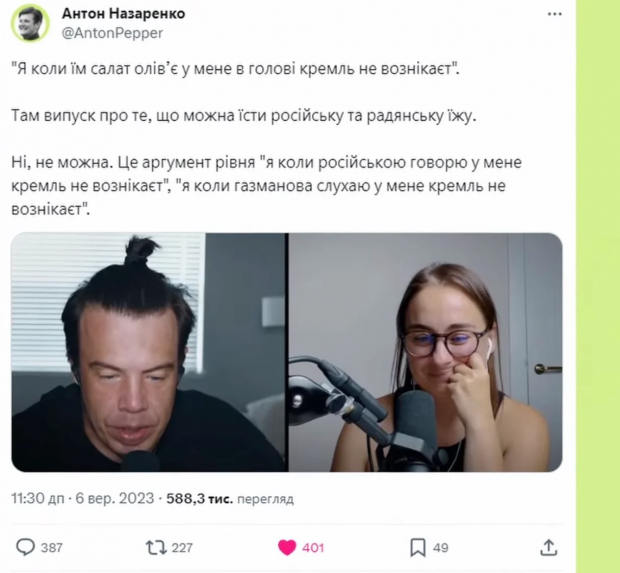 Антон Назаренко на своєму ютуб-каналі розповів, чому вважає олівʼє символом нав’язаних російських традицій. Його позицію масово підтримали користувачі соцмереж, а також відомі українці — зокрема Євген Клопотенко, Надя Дорофєєва та Міша Кацурін. Водночас частина аудиторії не побачила нічого проблемного у приготуванні салату і назвала дискусію перебільшеною.