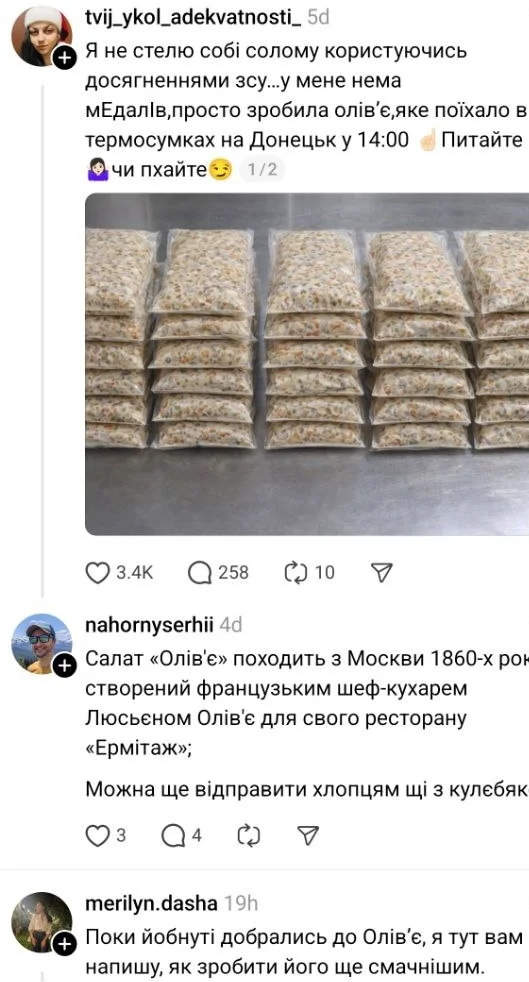 Проте є й такі, що не мають нічого проти салату на столі. Одна з користувачок Threads написала: «Я не стелю собі солому користуючись досягненнями ЗСУ… У мене нема медалей, просто зробила олів'є, яке поїхало у термосумках на Донецьк…».