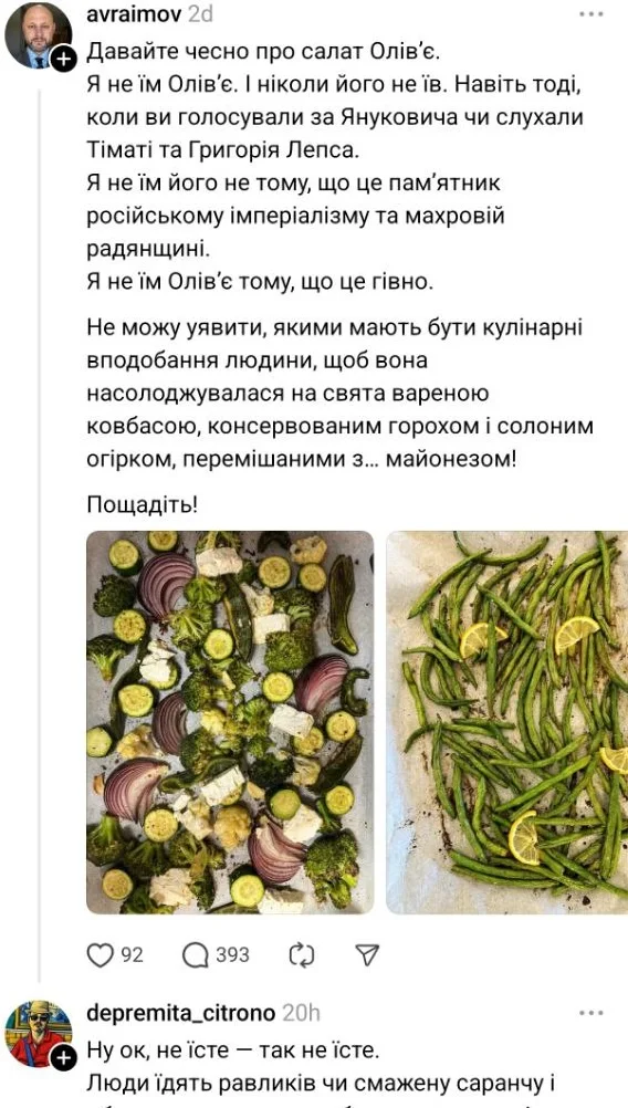 Він наголошує, що вперше підняв тему салату олів'є в мережі X (колишній Twitter), де його допис зібрав понад пів мільйона переглядів. «Я сперечався з думкою, що «коли я їм олів'є, для мене це просто смачний салат, і «Кремль у голові» при цьому не виникає», — пояснює блогер.