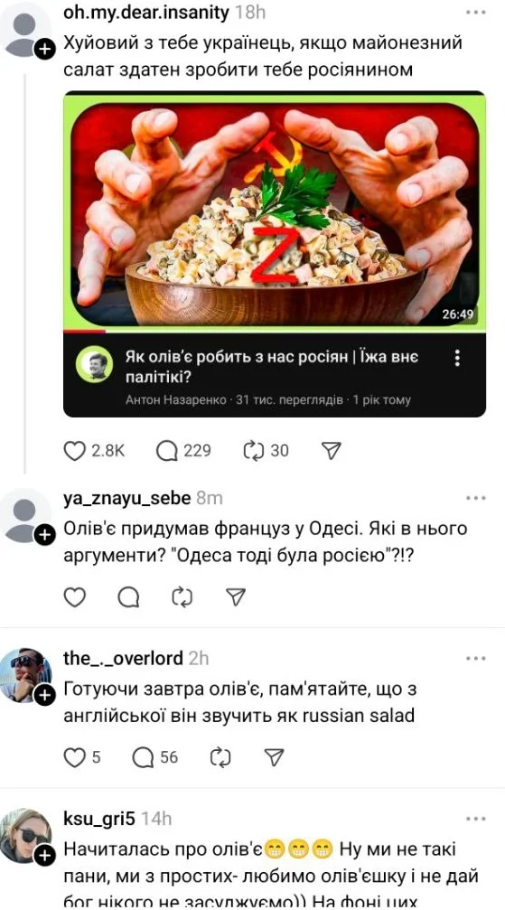 «Вибачте, але ми маємо перестати це їсти, бо олів'є — це культурна зброя країни, що знищувала українців мільйонами. І так смачненький майонезний салатик продовжує зросійщувати нас і робити з українців малоросів. Слухати Лєпса, дивитися Слово пацана і на Новий рік глянути промову Путіна — це те ж саме, що з'їсти олів'є…», — стверджує Назаренко.