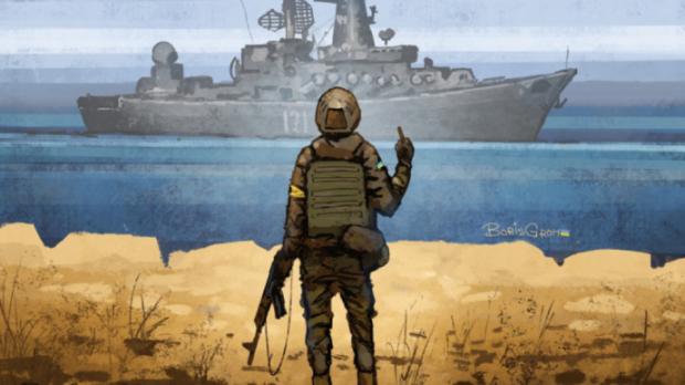 Пам'ятаємо, як купка сміливців-прикордонників оборонялась тут від флагмана і найпотужнішого корабля ЧФ ВМС РФ у жорстокі лютневі дні 2022 року, а їхня відповідь "Москві" на пропозицію здатися, облетіла весь світ: "Рускій ваєнний карабль іді на х*й!", надихаючи мільйони патріотів по всій Україні включатися у відчайдушну боротьбу з підступною Москвою, недоімперією зла.