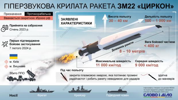 "Циркон" проєктувався як гіперзвукова протикорабельна крилата ракета, призначена для ураження надводних кораблів противника, оснащених системами протиповітряної та протиракетної оборони, і презентувався Путіним як "зброя ХХІ століття, якій нема аналогів".
