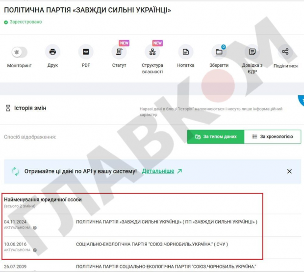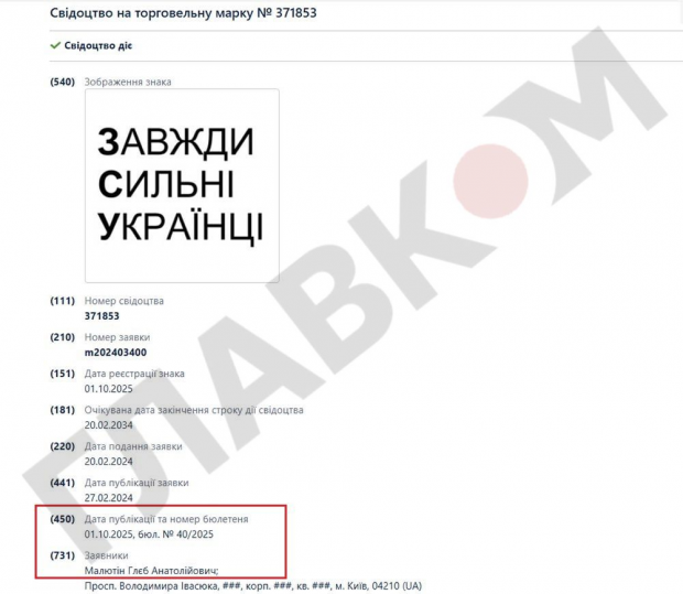 Новий партійний бос не обмежився лише зміною назви політичної сили: через державний реєстр торговельних марок він закріпив за собою назву «Завжди сильні українці». При цьому заявник Малютін прицільно зробив акцент на абревіатурі, яку створюють перші літери слів, з яких складається нова назва. При реєстрації торгового знаку заявник виділив жирним перші літери слів торгової марки, щоб сумнівів не залишалося: в Україні тепер є «ЗСУ».