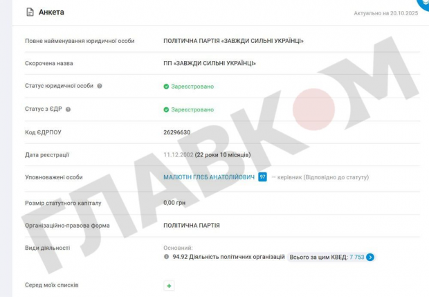 Датою реєстрації знаку зазначено 1 жовтня 2025 року. Прикметно, що заявку було подано ще у лютому 2024 року. За даними реєстру Politdata, єдиним джерелом доходу партії «ЗСУ» є внески самого Глєба Малютіна. Протягом IV кварталу 2024 року-III кварталу 2025 року він перерахував на рахунок своєї партії 90 тис. грн.
