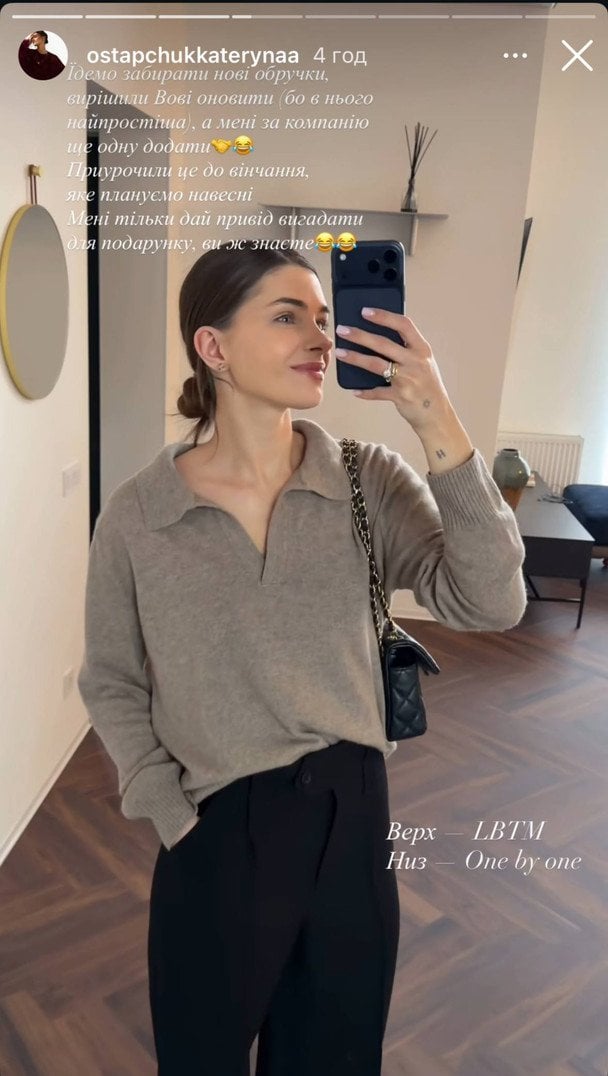 «Забрали нові обручки. Вові оновили, бо в нього найпростіша. А мені за компанію. Приурочили це до вінчання, яке плануємо навесні. Мені тільки дай привід вигадати для подарунка, ви ж знаєте», — поділилася Катерина з властивим їй гумором.