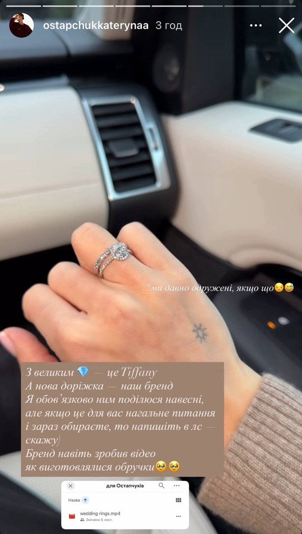 Блогерка вже продемонструвала власний перстень, підкресливши, що всі діаманти натуральні, а найбільший камінь — від ювелірного бренду Tiffany. Каблучку Володимира пара поки що не показує. «Пасують мені діаманти», — підписала Катерина, милуючись розкішною прикрасою.