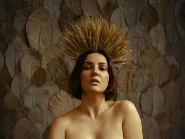 . Цибульська знялася без білизни й одягу, лише в головному уборі з колосся. Вона тримала в руках чорну курку.