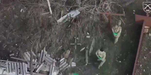 У відеоролику, який опублікували в підрозділі, можна помітити, що окупанта-конвоїра з двома українськими військовополоненими помітив оператор розвідувального дрона.