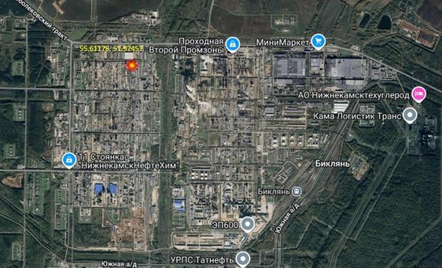 На Google maps бачимо, що за 200 м на північний захід — будівля цеху "Ремонтно-механический завод Нижнекамскнефтехим", а західніше на 80 м — дві градирні. Вибух стався на території хімічного підприємства площею 22 кв. км.
