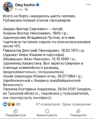 Кашин зазначив, що ім'я Хмаріна ретельно намагалися приховати зі списку пасажирів після НП. Він додав, що на борту також була Катерина Леонова 2007 року народження. Журналіст стверджує, що дівчина є моделлю з Тульської області, яка підписана в користувачів, як порнопослуги, онліфанс.
