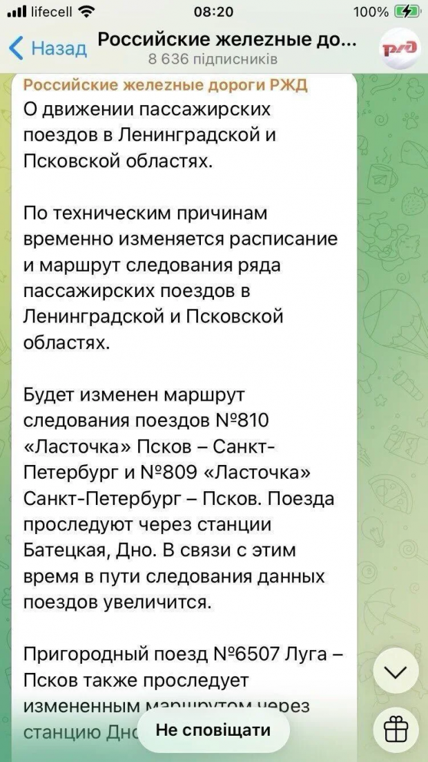 У ніч проти вівторка. 21 жовтня, на перегоні залізничного сполучення Псков — Санкт-Петербург у РФ стався підрив колій, що використовуються для військової логістики країни-агресора. Про це повідомляє NV з посиланням на джерела в українській розвідці, передають Патріоти України.