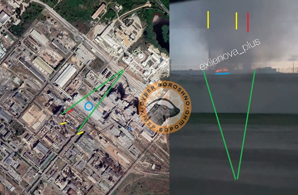 "На відео підтверджено горіння основного сховища добрив (на зображенні зону горіння позначено блакитним). Існує ризик масштабного вибуху; подібне влучання призвело до "Бейрута" в Дорогобужі", - пише канал КіберБорошно.