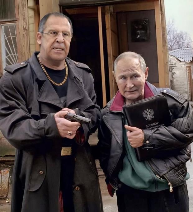 В опублікованому дописі – шарж із обличчями Путіна й Лаврова на одну зі сцен російського комедійного фільму "Піжмурки", де в оригіналі зображено Паніна в ролі бандита Сергія і російського актора і пропагандиста Дмитра Дюжева в ролі Саймона.