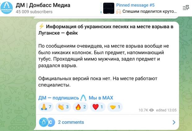 Пропагандистські пабліки пишуть, що з колонки нібито грала пісня українського гурту "Океан Ельзи". Проте "ДМ | Донбасс Медиа" назвав цю інформацію фейком. За словами очевидців, на місці інциденту була не колонка, а предмет, схожий на тубус, його зачепили, після чого пролунав вибух.