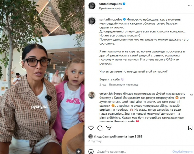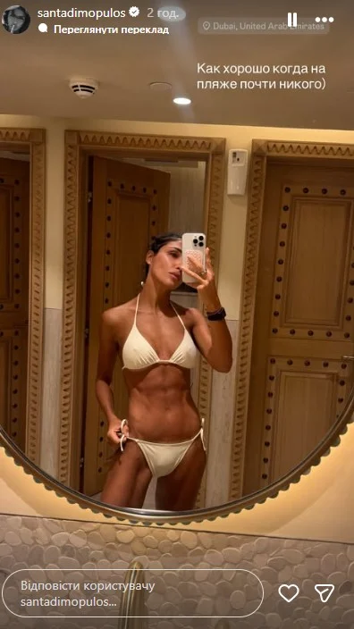 Співачка і переможниця Танців з зірками 2020 Санта Дімопулос, яка після початку повномасштабної війни в Україні переїхала в Дубай, вийшла на зв’язок і висловилася про ситуацію у місті. Колишня співачка, яка зараз проводить жіночі ретрити, зазначила, що у неї немає паніки. Але при цьому, вона накупила води та їжі. Дімопулос записала відео в Instagram, передають Патріоти України.