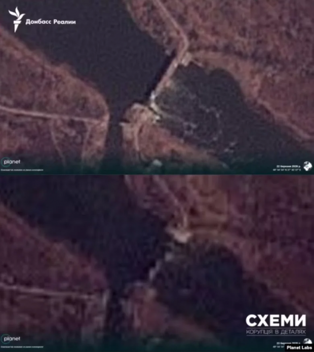 Проєкти РС Схеми та Донбас Реалії порівняли супутникові знімки греблі за 22 та 23 березня і дійшли висновку про зруйнування.