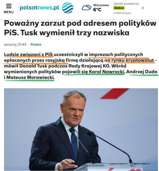Причому Туск стверджує, що на ці заходи було запрошено «колишнього президента (Анджея Дуду), нинішнього президента (Кароля Навроцького), віцепрем'єра (Моравецького) та бозна-кого ще, але загалом саму верхівку». «Як це можливо, що за гроші компанії, яка була створена на злочинні гроші, а потім була врятована російськими грошима, російською мафією і російськими службами, люди з партії PiS розважалися або організовували своє публічне життя і заходи?»