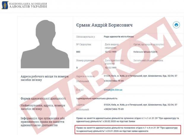 За даними реєстру адвокатів, 23 січня 2026 року Єрмак відновив адвокатську діяльність. Колишній очільник ОП не працював адвокатом з 20 лютого 2020 року, коли очолив Офіс президента. До того його практика тривала майже 25 років. Андрій Борисович отримав свідоцтво про право на заняття адвокатською діяльністю у далекому 1995 році. У жовтні 1997-го Єрмак разом із адвокатами Василем Ващенком і Михайлом Приходьком зареєстрували ТОВ «Міжнародна правнича компанія».