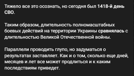 "Тяжко це усвідомлювати, але сьогодні був 1418 день "СВО" [так росіяни називають агресію проти України — ред.]. Таким чином, тривалість повноцінних бойових дій на території України зрівнялася з тривалістю Великої Вітчизняної війни [війна між нацистською Німеччиною та СРСР 1941-1945 рр. у рамках Другої світової]", — йдеться в повідомленні.