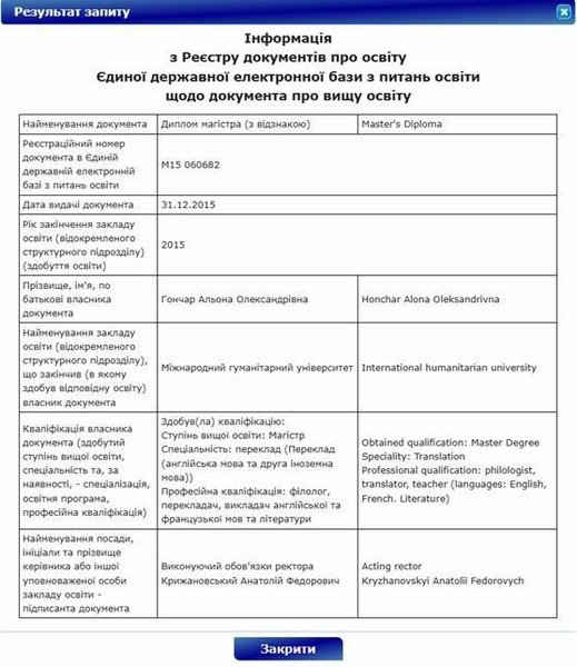 Перелік фактів, достовірно відомих про Олену Алієву, невеликий і переважну більшість із них Катерина Соляр перерахувала у своєму відео. Дівчина закінчила Міжнародний гуманітарний інститут в Одесі, отримала червоний диплом лінгвіста, володіє французькою та англійською мовами. Все це легко перевірити у відкритому реєстрі документів про освіту. Заміжжя за Гейдаром Алієвим та двоє дітей – теж загальновідомий факт.