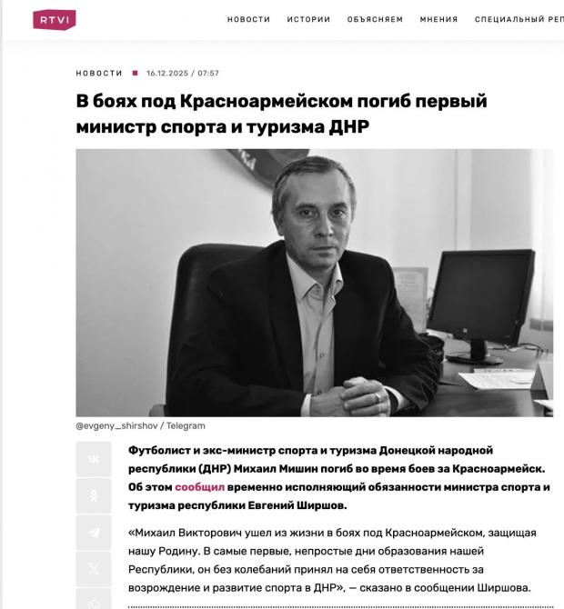 Як зазначається, Мішин вирушив на війну відразу після її початку. "У боях під Красноармійськом (ред. — Покровськом) загинув перший міністр молоді, спорту та туризму "ДНР" Михайло Мішин... У найперші, непрості дні утворення нашої Республіки він без вагань прийняв на себе відповідальність за відродження та розвиток спорту в ДНР. Його енергія, відданість справі та щира любов до спорту стали тим фундаментом, на якому будувався наш спортивний рух", — пишуть російські медіа.